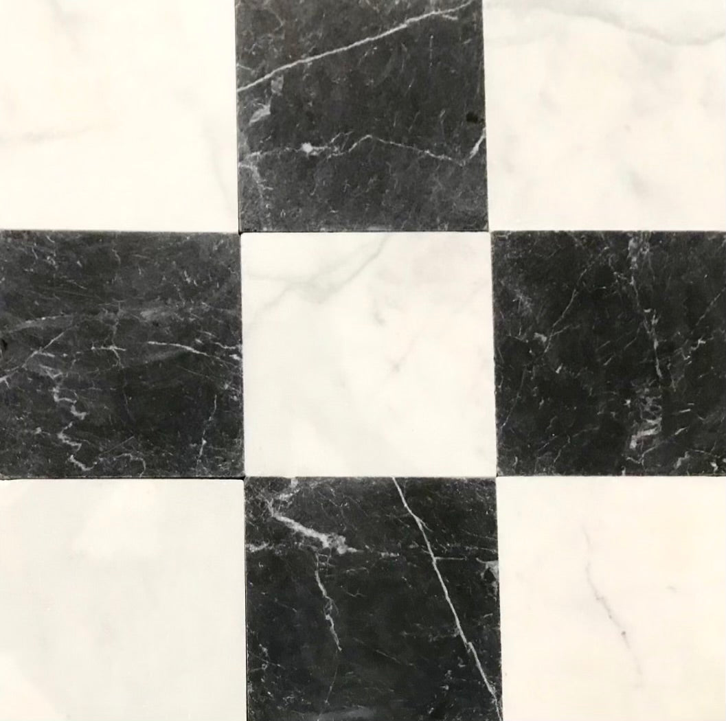 Checkerboard tiles exude a timeless and classic charm. The tumbling enriches and softens the marble and is ideal for hallways, entrance rooms and bathrooms. Available in large variety of colors, King Blue stone, Nero Marquina, Verde, Rossa Alcantara, Milos and Rojo Alicante.